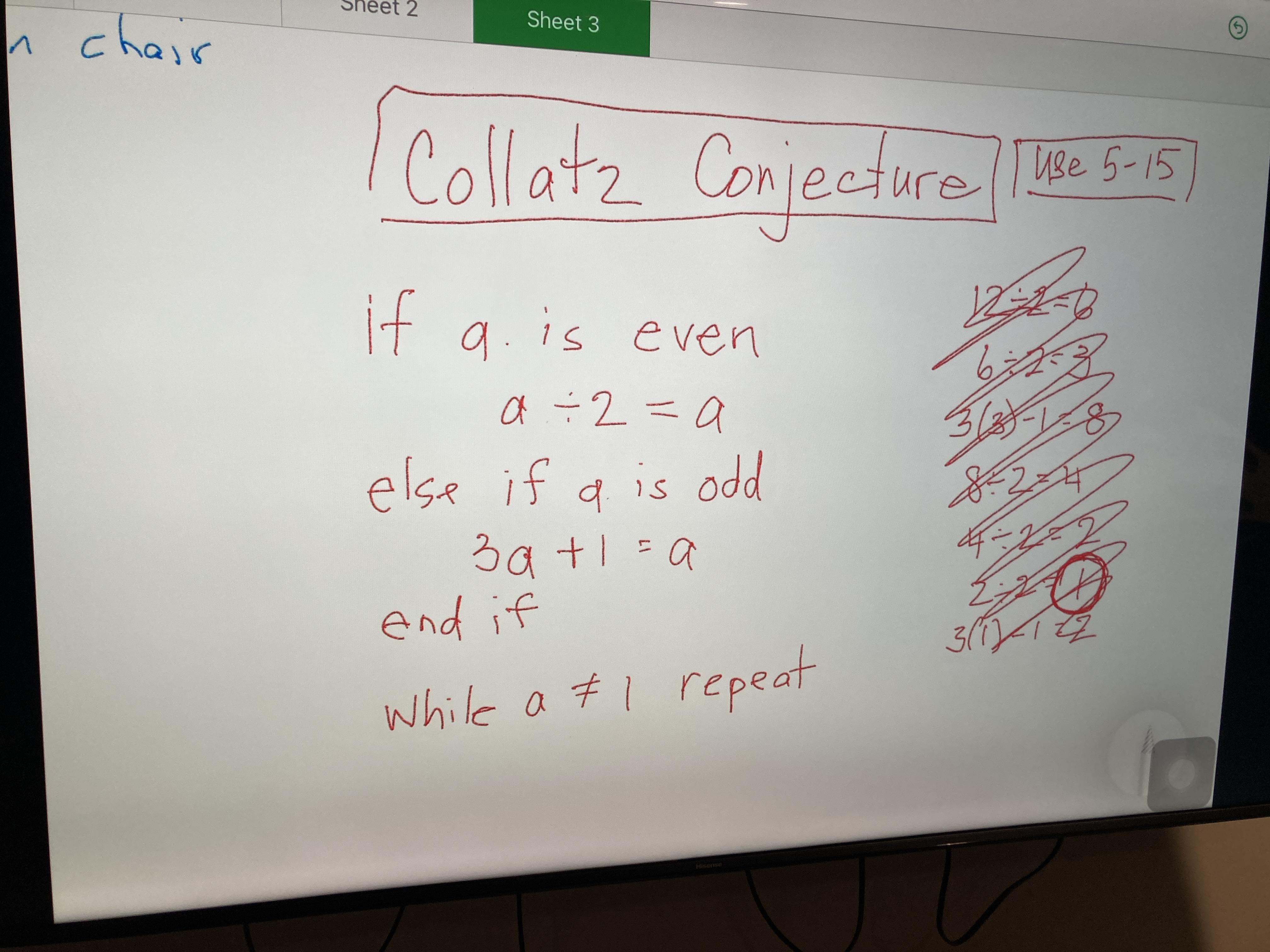 Using the Collatz Conjecture, calculate the step progression for AT LEAST THREE of the following 6 numbers: 9, 17, 21, 24, 37, & 256. I’ve attached the picture of the “code” from class on Thursday, and here is a brief review of the “code” and the logic that we discussed. I’ve also included an example number to help jog your memory.